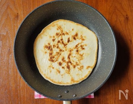 ⑧オリーブオイルを薄くひいたフライパンで、弱めの中火で焼きます。火が通ったところから膨れてくるので、フライ返しなどで押さえながら焼き、蓋をして弱火で1~2分蒸し焼きにします。
