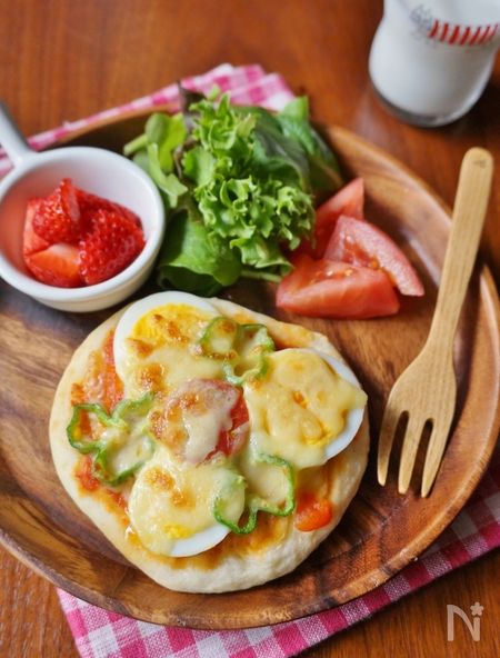 ピザ生地にトマトソースを塗り、ゆで卵やウインナー、ピーマンやトマトを載せ、チーズを散らします。