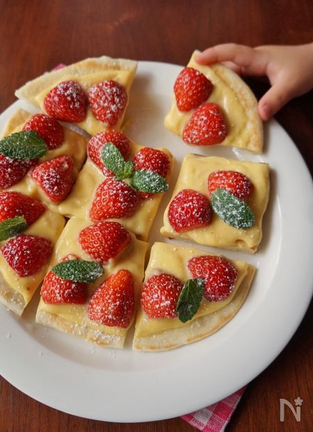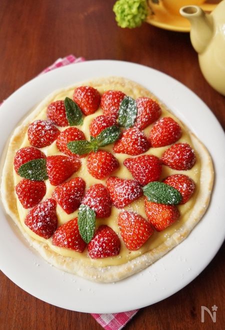カスタードクリームをたっぷりぬって、イチゴを散りばめたデザートピザはお腹がいっぱいでもつい手が伸びるはず!