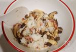 きのこを加えて炒め、きのこがしんなりしたらバターの半量と醤油を加えて炒め合わせる。 | |