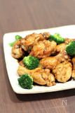 A 醤油 1/4カップ、みりん 1/4カップ、砂糖 大さじ3、ニンニクのすりおろし 少々 を合わせて、鶏手羽元に絡めるように中火で煮絡める。とろみが付いたら器に盛り付ける。好みでポテトサラダやミニトマトなどを添える。(ここではクリスマスを意識して、ポテトサラダにブロッコリーを添え、ツリー型に成型しています。) |