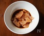 鶏むね肉は皮を取り除き、1センチ程度の厚さにそぎ切りにする。ボウルに入れてA しょうがのすりおろし 小さじ1、酒 大さじ1/2、醤油 大さじ2 を加え、手でしっかりともみ込み、10分ほどおく。 |