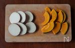 かぼちゃは種とワタを取り除いて5~8ミリ程度の厚さに切る。大きければ一口大に切る。 サツマイモは5~8ミリ程度の厚さの輪切りにし、水にさらしてアクを抜く。しっかりと水気をふき取っておく。 |