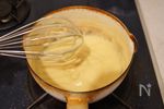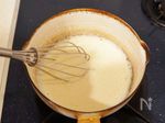【カスタードクリームを作る】 小さめの鍋に卵黄と砂糖を入れて、泡だて器ですり混ぜる。さらに薄力粉を加えて混ぜ合わせたら、牛乳を加えて弱火にかける。ダマができないように泡だて器で混ぜ続ける。 |