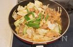 玉ねぎがしんなりとしたら、キャベツ、ニラを加えて手早く炒め合わせ、器に盛り付ける。 | |