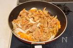 肉の色が変わったら、玉ねぎ、ニンジンを加えてさらに炒める。 | |