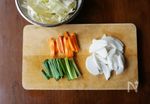 玉ねぎは薄切りにする。ニンジンは短冊切りにする。キャベツは食べやすい大きさにざく切りにする。ニラは5センチ程度の長さに切る。 | |