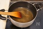 鍋にA 粉寒天 3ℊ、水 250㎖ を入れて煮溶かし、砂糖、はちみつ、醤油を加える。 |