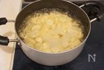鍋にさつまいもを入れ、かぶる程度の水を注いで茹でる。竹串を刺してみて柔らかくなったらザルにあげる。 | |