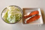 生鮭には塩コショウ少々(分量外)をふる。 キャベツは一口大に切る。 |