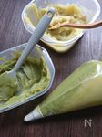 2の半量にE 抹茶 小さじ1 を加え2色にし(冷めたら)絞り袋に入れて冷蔵保存★ |