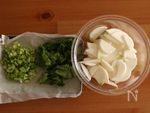かぶ(葉つき)は、葉の部分も含めしっかり洗う。 葉の部分は根元から切り落とし、かぶは皮をむき、厚さ2〜3mmのいちょう切りにする。 茎は5mmほどに、葉の部分は1cm幅に切り、キッチンペーパーでしっかり水気を拭き取る。 |