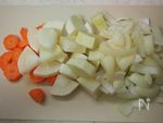 玉ねぎは半分に切ってから更に縦に半分にし、繊維を断ち切る方向に1cm幅に切る。 大根は2cm厚さのいちょう切り、人参は1cm幅のいちょう切りにする。 |