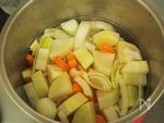 圧力鍋に玉ねぎ、大根、人参、水、昆布、✩を入れて強火で沸騰させる。(この時に圧はかけない。軽く蓋をしておくと早く沸騰します。) | |