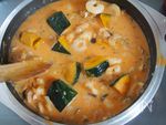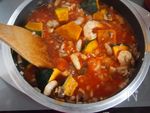 A トマトジュース 100cc、コンソメ顆粒 小さじ1 と1のかぼちゃを加えて1〜2分煮る。 |