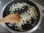 玉ねぎはみじん切り、しめじは石づきを取って荒く刻む。 深さのあるフライパンに、なたね油、にんにくスライス、玉ねぎを入れて、中火で透き通るまで炒める。 ※煮込まず短時間で仕上がるので、ここで玉ねぎはしっかり火を通してください。 でないと、仕上がりの玉ねぎが生っぽくなります。 |