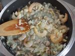 しめじ、冷凍むき海老も加えて、お酒をふって炒め、アルコール分を飛ばし臭みを消す。 (水分は残っていて良い。) |