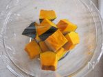 かぼちゃは一口大に切り、耐熱ボウルに入れてラップをかけ、レンジ600wで3分加熱する。 | |