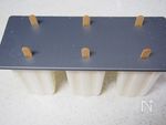 アイスキャンディーの型に流し入れ、スティックを挿して冷やし固める。 抜き取る時は、プラスチックの容器ごとぬるま湯につけて、周囲を少しとかすと簡単に抜けます。 ※専用の型がなければ、紙コップでも。 または、製氷皿などで一口サイズで作っても。 |