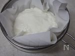 ボウルにザルをのせてペーパータオルを敷き、そこにヨーグルトをのせ、冷蔵庫で 一晩水切りする。(約半分の重さになります。) ※水切りヨーグルト150ccは、450g(1パック)のヨーグルトを一晩水切りして、少し余るくらいです。 |
