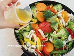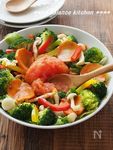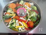 にんじん、プロッコリー、パプリカ、しめじを彩りよく散らし、A ベジブロス 100cc、塩 少々 を注ぐ。※ベジブロスがない場合は、Aの代わりに、B 水 100cc、コンソメ顆粒 小さじ1 を使う。 |