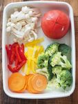 トマトはヘタを取り、へたと反対側に浅く十文字に包丁を入れる。(蒸したあと、皮がむきやすい) にんじんは皮をむき、1mm厚さの薄切り、ブロッコリーは小房に分ける。 パプリカは、種とわたを取り、細切りにする。 ホワイトぶなしめじは石づきを取り、小房に分ける。 |