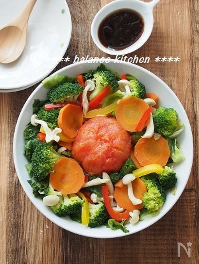 1人で、レタス1/2個と1日分の緑黄食野菜がペロっと食べられます。 これさえ食べれば、一気に野菜不足解消! オイスターソースとトマトのダブルの旨みで、最高に美味しい。 冷え症の方も蒸しサラダなら安心^^