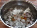 ラップを茶巾状に絞って輪ゴムで止め、氷水の中に入れて冷やし固める。(行程2~3で、同様に10個作る) | |