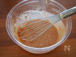 真ん中にくぼみを作り、そこに卵、牛乳、なたね油を入れて、泡だて器でむらなく混ぜる。 | |
