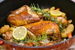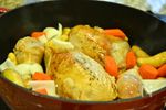 耐熱皿に鶏肉を移し、ひと口大に切った、じゃがいも、玉ねぎ、にんにく、にんじんを一緒に載せて200度のオーブンで1時間焼きます。焼き上がりは、温度計で計測してください。厚い部位にナイフを入れて 透明な肉汁が流れてきたら焼けています。 | |
