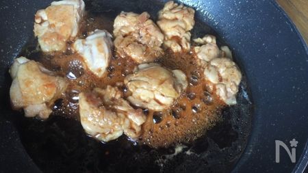 フライパンに合わせたダレを加えて煮立たせ、肉をひっくり返して全体にタレが絡むようにしっかりと煮絡めます。
