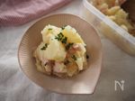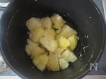 じゃがいもは水から茹で、竹串が通る固さになったら、 いったん火からおろし、再度火にかけて粉ふきいも状態にする。 (茹で汁をとっておき、再度火にかけるときに少量加えると、 粉ふきいもにしやすいです。) |
