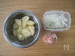 じゃがいもは皮をむき、一口大に切り、水に5分ほどさらす。 ロースハムは短冊切りに。 玉ねぎは薄切りにし、塩をまぶしてかるくもみ、ぎゅっとしぼる。 |