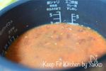 炊飯釜に米を研がずに入れたら、Aを加えてから白米3合分の目盛りまでの水加減にする。 すりおろしにんじん、にんにく、玉ねぎを加えてひと混ぜしたら30分ほど浸水させる |