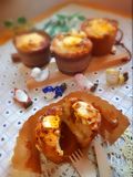 紙コップに生地を入れ、オイルをつけたスプーンでで真ん中に穴をあける。 カレーを入れスライスしたゆで卵とチーズを上にのせる。 |
