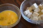 高野豆腐は、たっぷりの水に浸し戻しさいの目切りにする。 卵は溶きほぐす。 |
