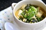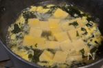 鍋にA 水 400cc、顆粒中華スープの素(創味シャンタン使用) 小さじ1、醤油 小さじ1、料理酒 小さじ2 を入れ強火にかけ、沸騰したら戻した高野豆腐と乾燥わかめを入れ、ひと煮立ちしたら、溶き卵を流し入れ火を止める。 |