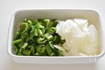 玉ねぎは薄切り、ピーマンは種を取り除き細かく切る。 | |
