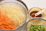 じゃかいもと人参は千切りスライサーで切る。 ピーマンも千切りにする。 A 酒・みりん 各大さじ1、砂糖・醤油 各小さじ2 を混ぜ合わせる。じゃかいもは水にさらしアクを抜く。 |