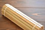 すだれに焼き色がついてる方を下に置き、 巻いて両端を輪ゴムで止め粗熱をとる。 |