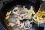 水を火にかけ、沸いたら、A 冷凍シーフードミックス(海老、イカなど) 適量、しいたけ 3個 を加える。 |
