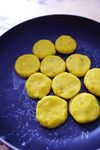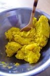 冷めないうちに片栗粉を入れて混ぜます。 牛乳を様子を見ながら大1〜2いれる。 一口大にとって小判状にします。 |