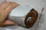 生地が冷めたら、アルミ箔(オーブンシート)をはずして オレンジマーマレードジャムを巻き、形を整える。端を切り落として、切株の形にする。 | |