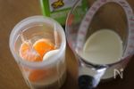 みかんは皮をむき、適当な大きさに割る。 バナナは皮をむき、一口大に切る。 豆乳を半分入れて、ミキサーでしっかり撹拌する。 |
