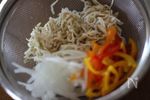 切干大根は流水で洗い、絞らずにそのままザルにあげて置いておきます。 カラフルピーマン・玉ねぎは食べやすいよう細く切ります。きゅうりも食べやすいように細く切ります。(工程写真はきゅうりを切る前です) |