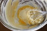 溶きほぐした卵を少しずつ加えてしっかり混ぜます。 常温の卵を少量ずつ加えながら混ぜると分離しにくいです。 |