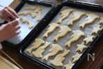 お好みの型で抜き、天板に並べます。 型で抜いていくうちに、生地が圧かいにくくなったら、再び生地を冷やしてください。 オーブンの温度を170℃に下げ、15分焼きます。 |