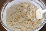 粉類を加えてゴムベラでまとめます。 練るような混ぜ方をすると粘り気が出て仕上がりが変わってくるので、そうならないようにゴムベラで切るようになじませます。 |