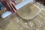 生地を5mmの厚さに伸ばします。 上下、ラップで挟むとよごれにくいし、後片付けが楽です。 |