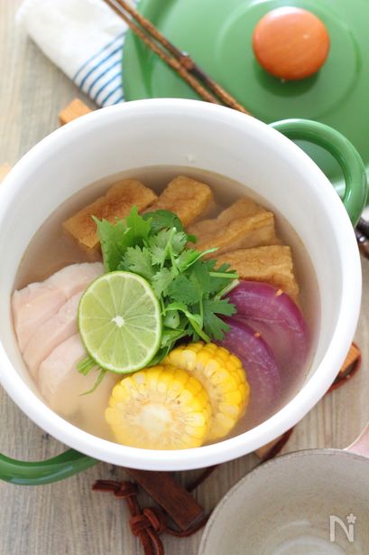 鶏がらスープの素と、ナンプラーを使って、あっさりしたエスニックおでんを作ります。 市販のサラダチキンを使っているので、あっさり。 冷やしても脂が固まる事がないので、スープも最後までいただけます。 パクチーやライムはお好みで、食べる時に添えてください。